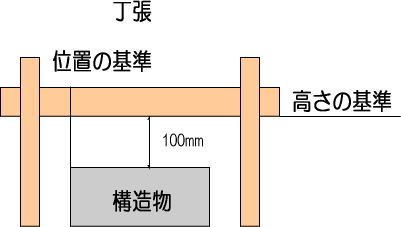 この丁張を目標にして作業員は掘削したり、ブロックを設置したりします。丁張は作業を邪魔しないよう目標物から少し離して設置します。丁張の高さ-100mmが目標物の基準とするなどします。