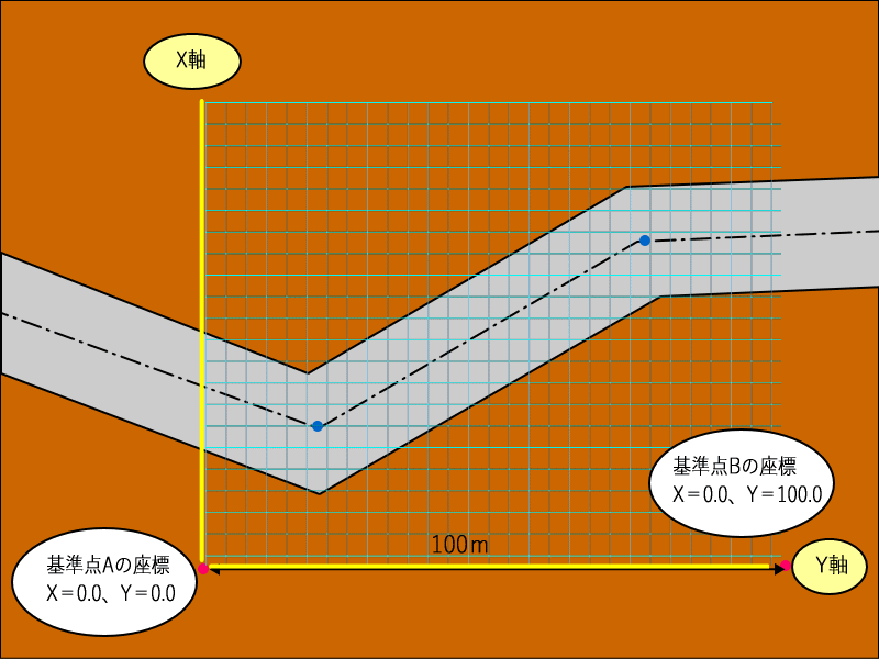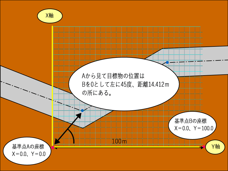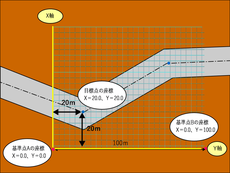 測量では通常縦方向をX軸、横方向をY軸と表現します。基準点はそれぞれX=0.0,Y=0.0、X=0.0,Y=100.0と考えます。グーグルマップの位置情報の緯度、経度を局地的に現場に応用する訳です。