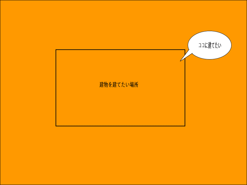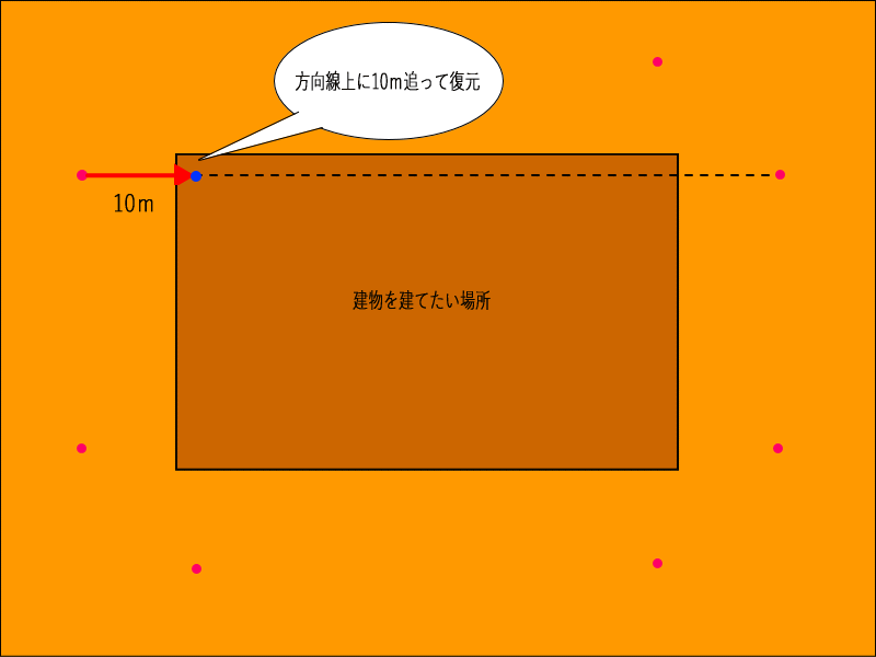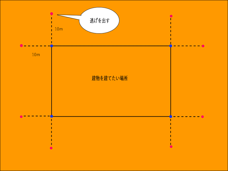 建物を建てたい場所に●を設置してそれを目印にすればよさそうですが、実際は施工中に掘ったりしてそれが無くなってしまいます。なので最初からある程度離れた場所に●のような逃げを設置しておきます。そうすれば●がなくなっても●があればポイントの復元が可能です。逃げは木杭や墨、ペイント、刻み等で設置します。順を追って見ていきましょう。
