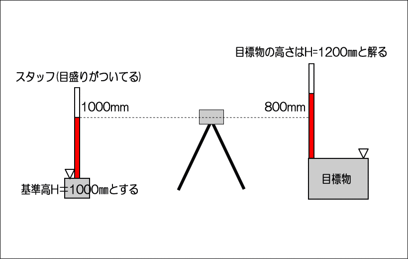 例:基準高さをH=1000㎜とし目標物の目盛りの読みが800㎜すると目標物の天端の高さはH=1200㎜だとわかります。