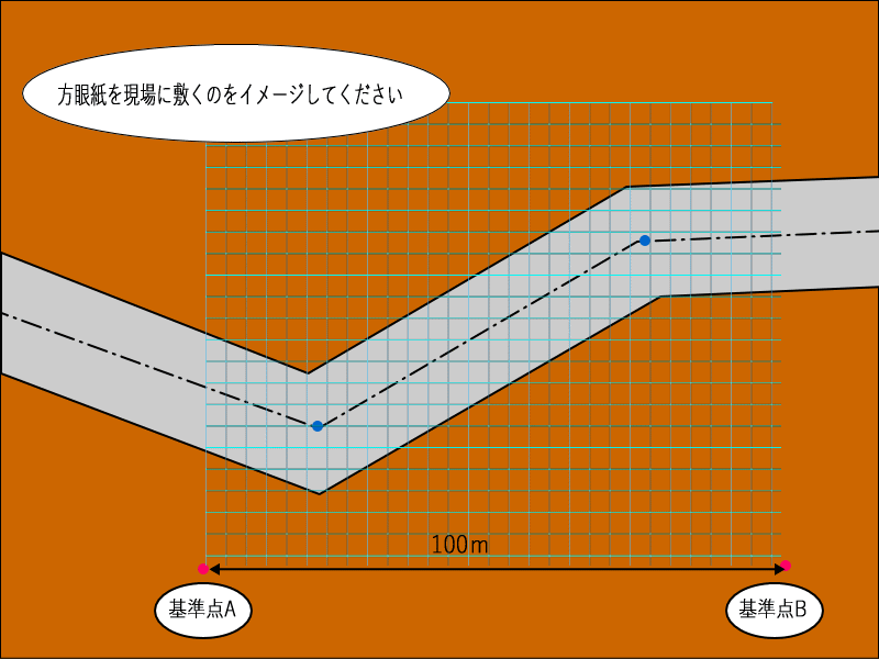 例えば道路を新設する工事の場合、全て直角という訳にはいきませんので、座標の概念を用います。